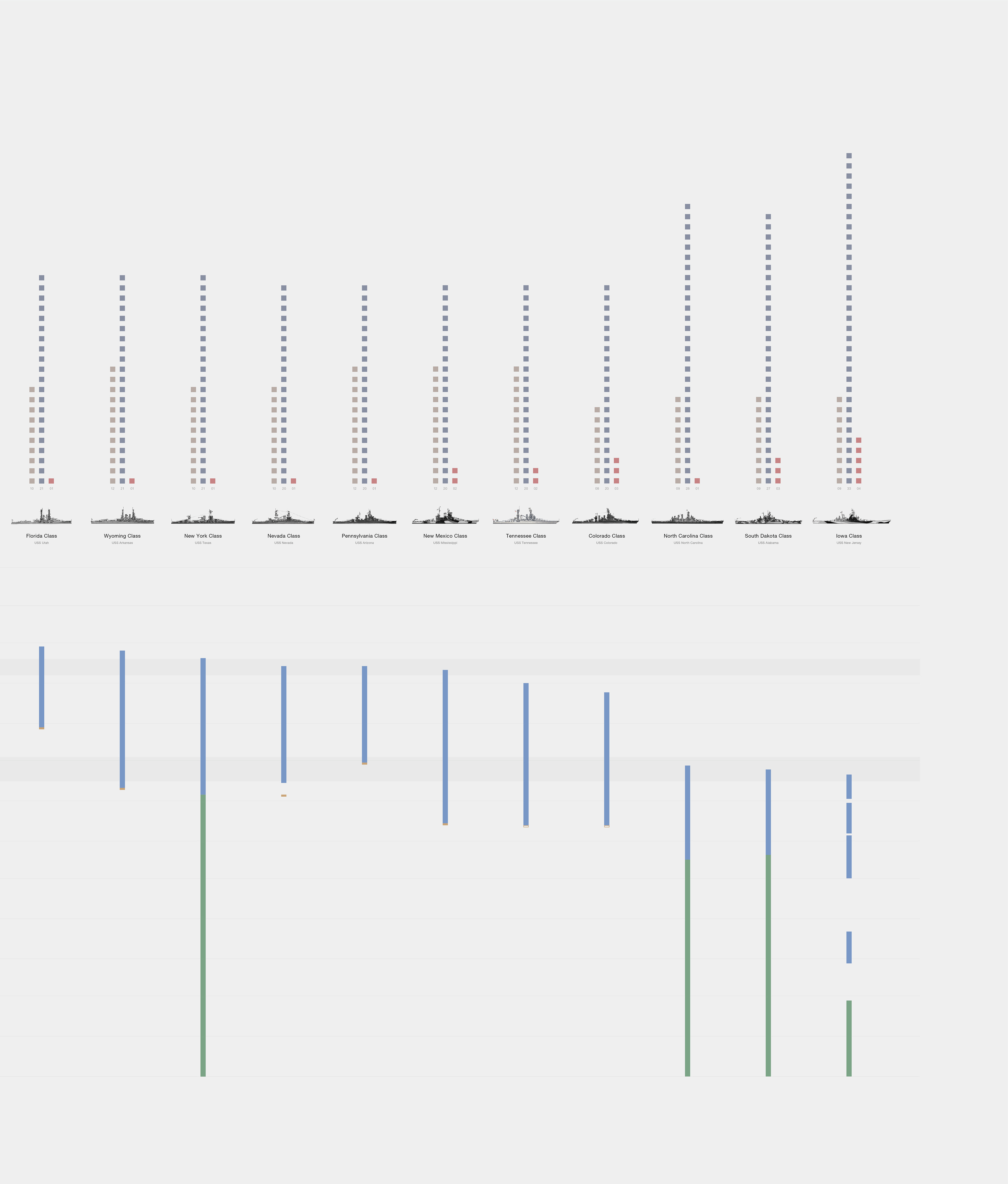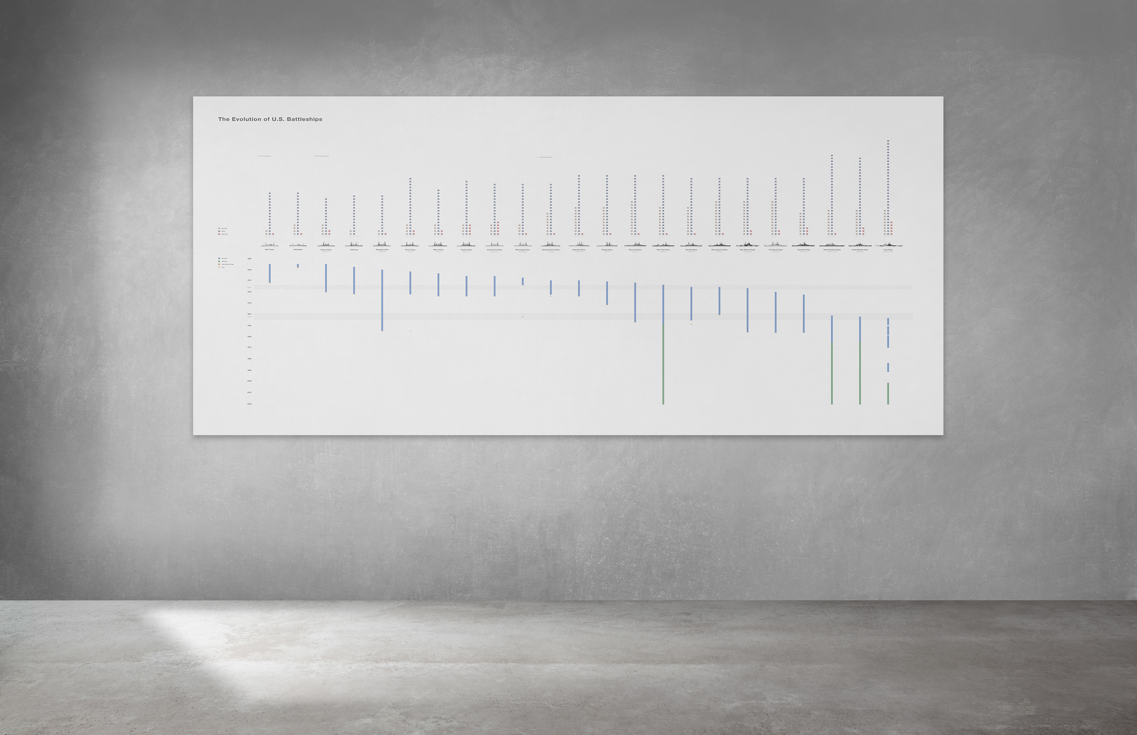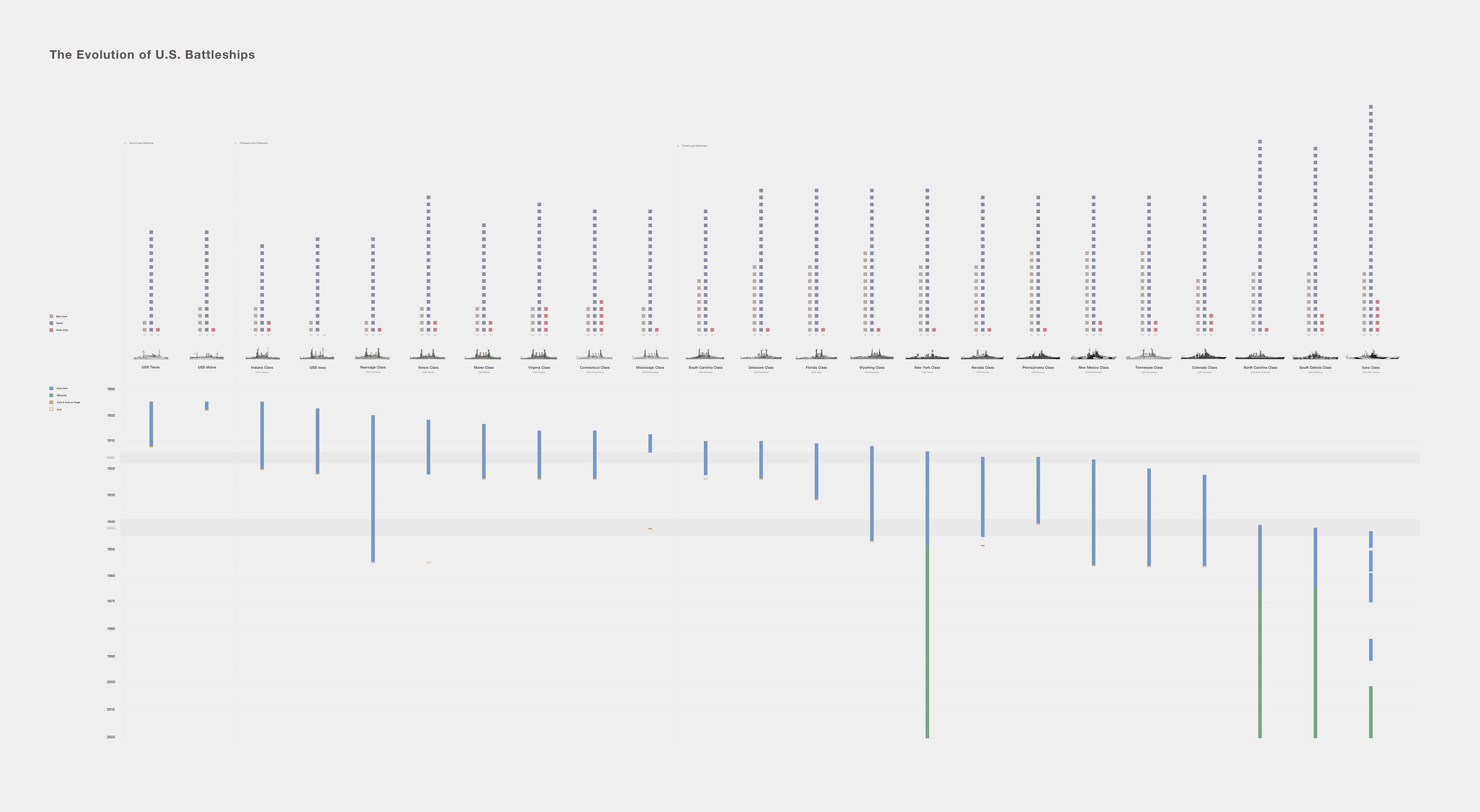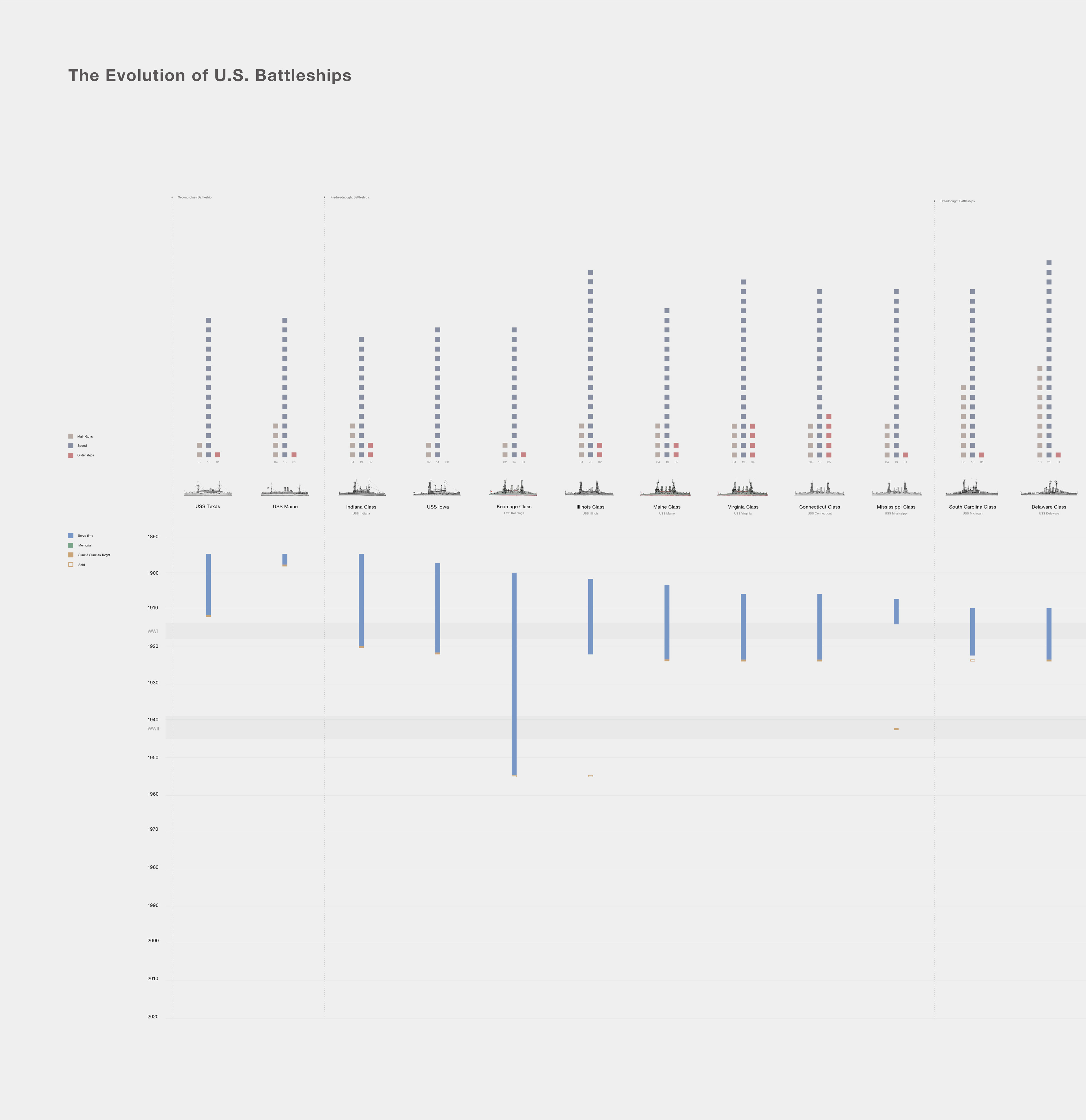 Joseph Priestley created the timeline to show data simultaneously while also bringing attention to relationships. And this timeline is presenting the evolution of U.S. battleships.